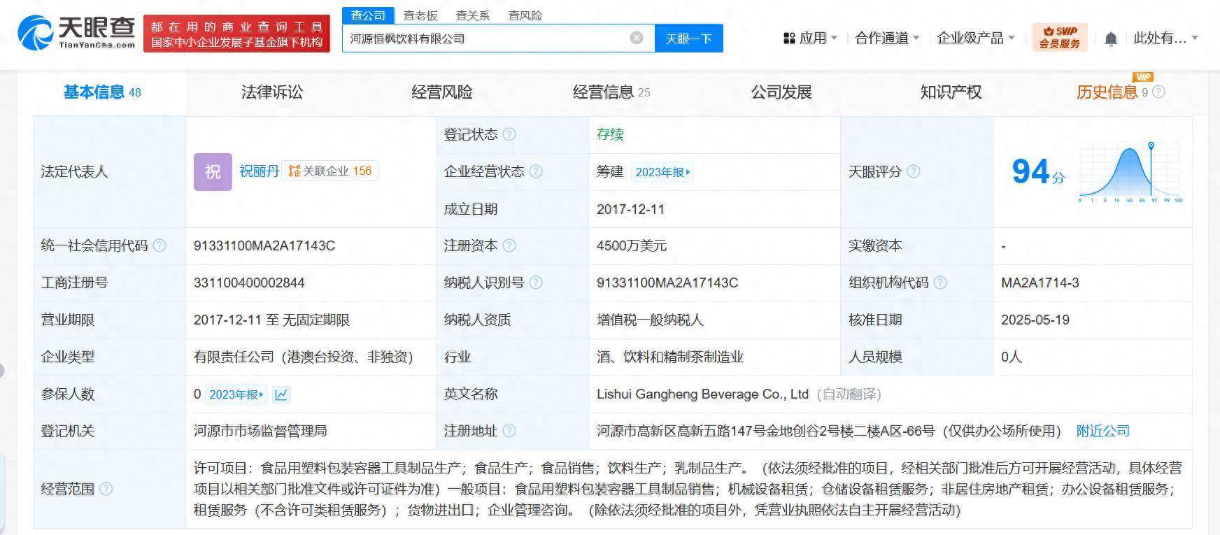 天眼查App显示,近日,河源恒枫饮料有限公司发生工商变更,宗馥莉卸任法定代表人,由祝丽丹接任专业的股票配资官网,同时,宗馥莉由执行董事、经理变更为董事,祝丽丹任经理。浙江启力投资有限公司退出股东行列,新增宏胜饮料集团有限公司为股东,同时,多位主要人员发生变更。